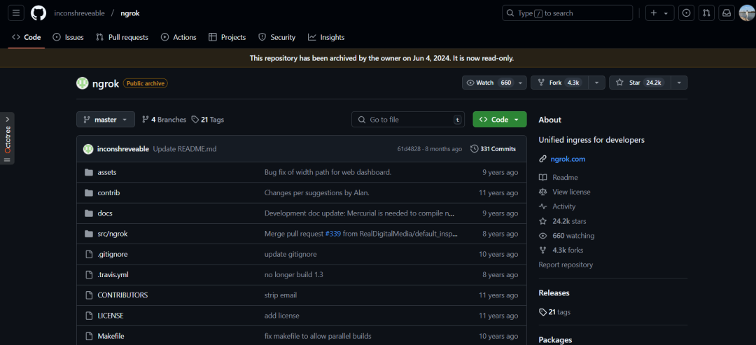 Ngrok 是一个广受欢迎的内网穿透工具,通过简单的命令启动即可为本地服务生成一个公网可访问的地址。Ngrok 不仅支持 HTTP 和 TCP 协议的转发,还具有易于使用的 Web 控制台。