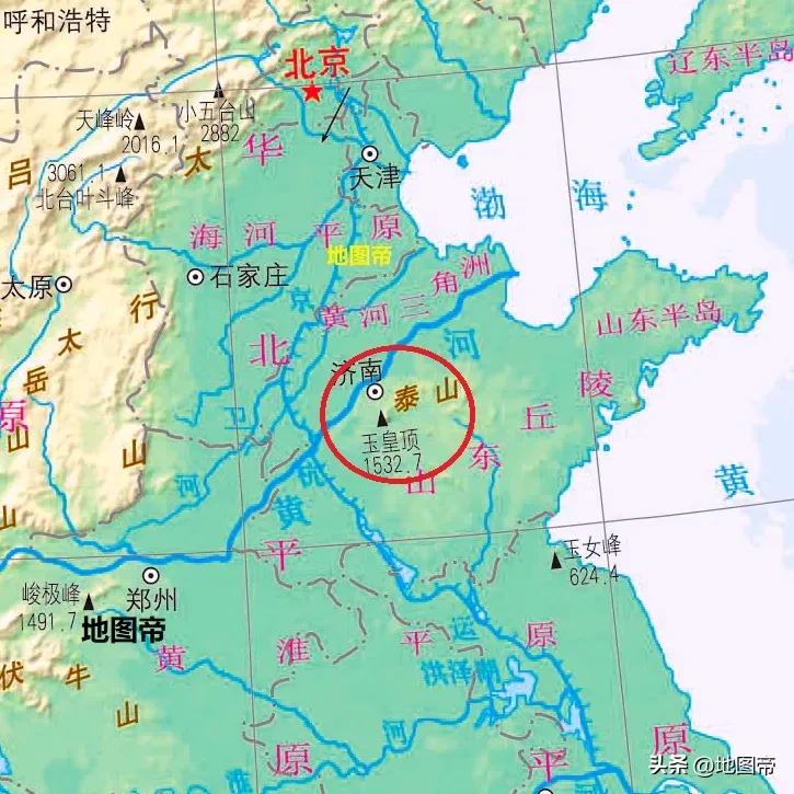在一马平川、一望无际的华北平原中部,耸立一系列山地丘陵,包括泰山、鲁山、沂山、蒙山、尼山等,称为鲁中南山地丘陵,其中海拔最高的是泰山。古代由此纵横四出,扫定齐鲁,均为高屋建瓴之势。
