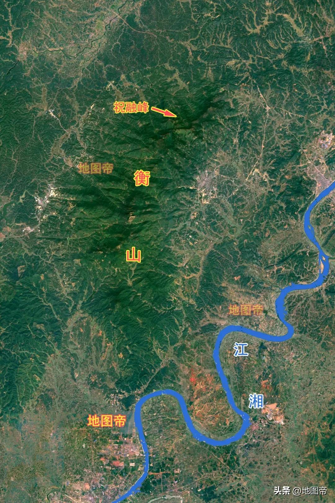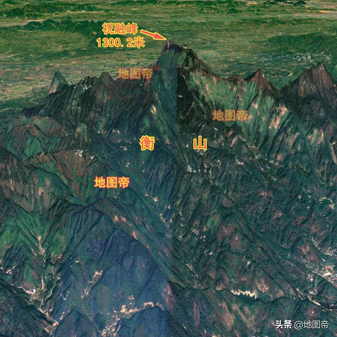 衡山呈南北走向,南北长约38千米,东西最宽处约17千米,面积约640平方千米。衡山是一整块花岗岩石,有七十二峰,海拔高度超过1000米的山峰20座,最高峰为祝融峰,海拔1300.2米。