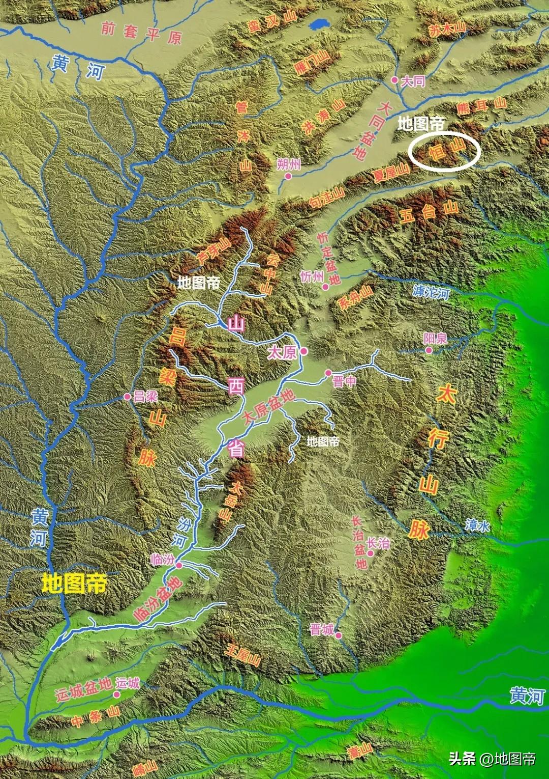 恒山是太行山脉的支脉,呈西南-东北走向,长约200余千米。恒山北面是大同盆地,南面是忻定盆地,是海河支流桑干河与滹沱河的分水岭。恒山最高峰是馒头山,海拔2426米;主峰天峰岭,海拔约2016.1米。