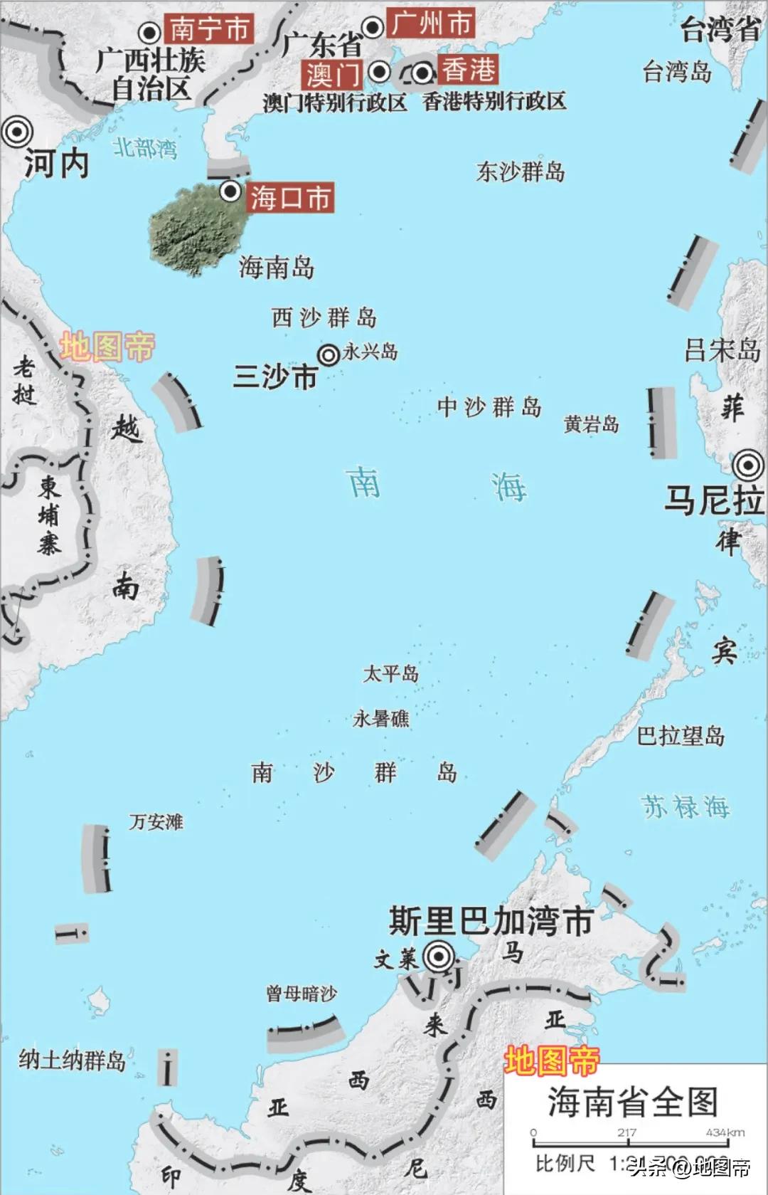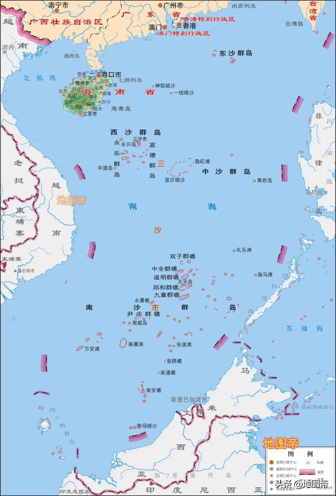 2012年,海南省三沙市成立,辖西沙群岛、中沙群岛、南沙群岛的岛礁及其海域(东沙群岛属广东省汕尾市),行政中心在永兴岛,是中国纬度最南的城市。