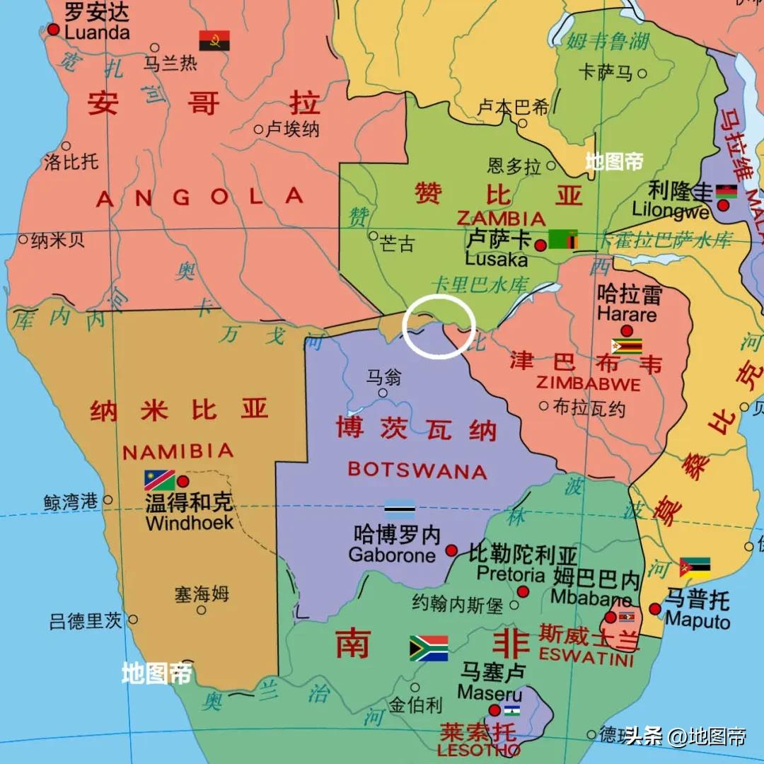 这四个国家,北边是赞比亚,东边是津巴布韦,南边是博茨瓦纳,西边是纳米比亚。四国在赞比西河顶在一起,近距离航拍,才能看得清,南北两个国家是接壤的,边界只有150米,东西两个国家却被隔开了。