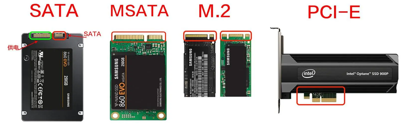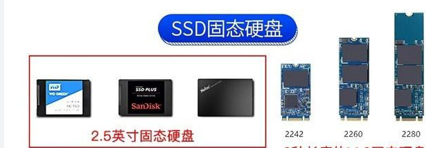 固态硬盘(SSD):常见的接口形态有多种,包括SATA接口(只有2.5英寸)、mSATA、M.2 SATA接口、M.2 nvme接口、PCIe接口等。而M.2有多种长度版本,常见三种,分别为2242、2260和2280(笔记本中常见)。