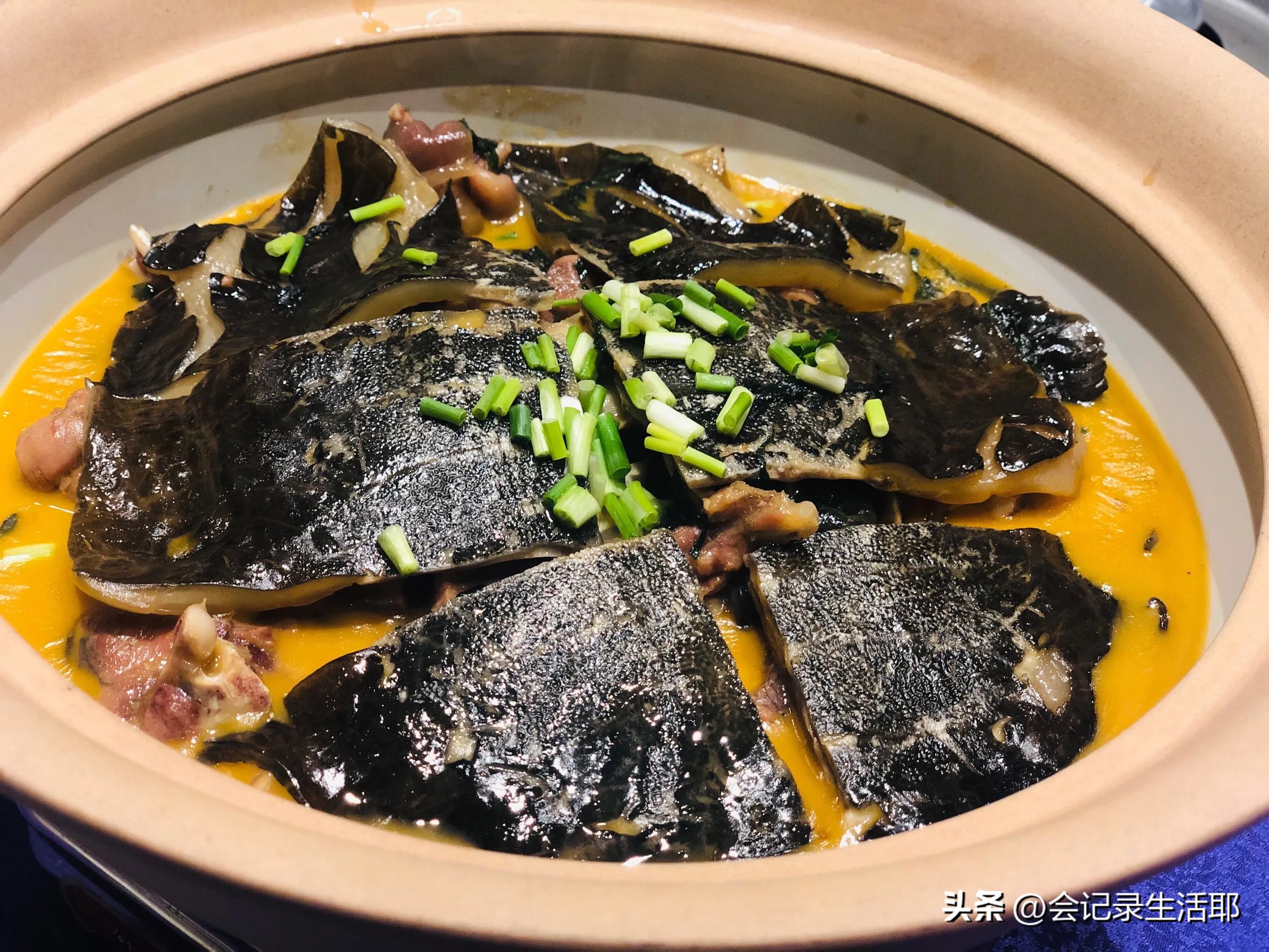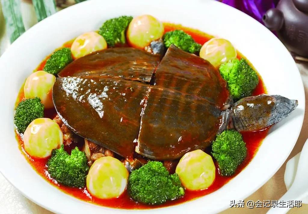 洞庭金龟是湖南岳阳的特色传统名菜,它是用金龟肉为主要食材,配以猪五花肉、冬笋、香菇等食材,精心制作而成。制作时,先将龟肉和五花肉进行煸炒,再加入酱油,放入桂皮、八角、干红椒、精盐、白糖等多种调料,经过小火煨制,最后放入冬笋、香菇,撒上香菜等即可。成品色泽金黄,龟肉软烂入味,咸鲜香辣,醇厚浓郁,汤汁浓郁,口感鲜美。