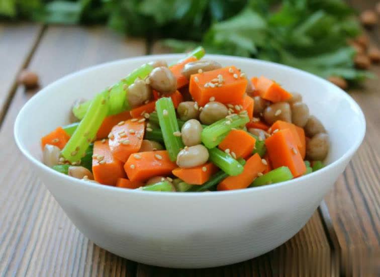 材料:鲜芹菜 250克;花生米 50克;蒜末 适量;食盐 适量;香油 适量;生抽 适量;白糖 适量;醋 适量