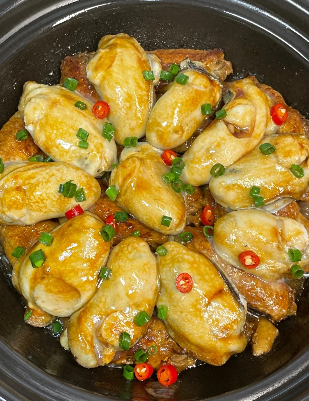 5.放吐沙的生蚝,轻轻推开避免粘底,继续小火炖 10 分钟(生蚝易熟,炖久了会缩,保持鲜嫩),最后加盐调味,撒葱花。我试过多次发现,生蚝后放既保鲜又不腥;汤里别加太多调料,突出鲜甜味,老公用勺子舀着吃,鸡翅嫩脱骨,生蚝鲜掉眉,补劲抗累,干活不软脚。