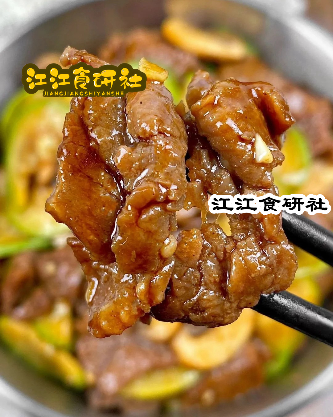 3.热锅冷油,油烧至七成热,放蒜末炒香,倒入腌好的牛肉片快速翻炒 1 分钟(牛肉表面变色、边缘微焦即可,七八成熟最嫩),盛出来备用。