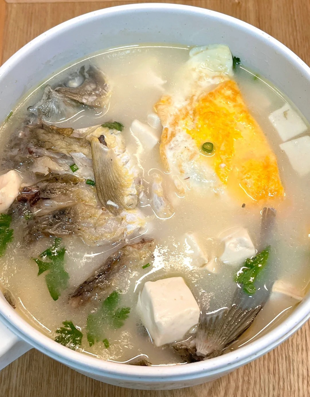 5.放豆腐块和煎好的鸡蛋(鸡蛋提前煎成荷包蛋切块),轻轻推开避免粘底,继续小火煮 10 分钟(豆腐炖软吸汤鲜),加少许盐、白胡椒粉调味,撒葱花,关火前滴几滴香油增香。这样煮的汤奶白暖身,鲫鱼嫩不腥,豆腐吸满汤鲜,老公端着碗能喝光,暖身提气,腰不凉了,抗寒有底气。