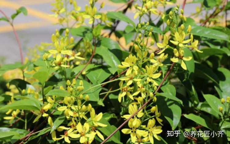 星果藤又叫做三星果,它是一种开花植物,开花的时候是黄颜色,开花性能非常的强,小齐养了一棵养了两年的时间,逐渐摸索出它的养护习性,如果你想养的话一定要选择一下,它的长势非常的快速,一棵小苗一年就能够爬满两米高的花架,当做花墙去栽培也是非常合适的,但是他怕低温,要保证冬季温度在五度以上,而且要有一个光照充足的环境。再去水肥跟上,它就会快速的生长,它开花性能非常的强,主要的花期是在春秋两季,夏季高温,如果缺光它是不开花的。冬季温度低于十度会停止生长,所以如果你想养,保证合适的温度,给它水肥跟上,光照充足,它就能够一直长一直开。开花的时候成片开,黄灿灿的花挂在上面非常的美。