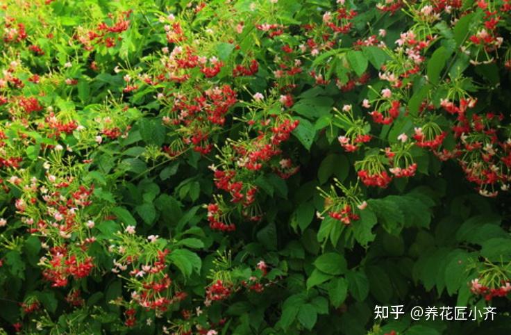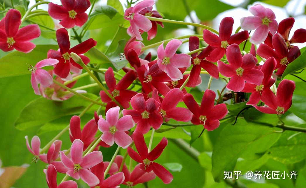 使君子是一种比较冷门的藤本植物,攀爬性能非常的强,小齐去年的时候栽种了一棵,栽到花棚里靠墙栽种的,一年的时间将整个墙爬满,而且棚顶也长的满满的,它的花期主要是在夏秋两季,开花的时候一穗一穗,红颜色非常的美,也有白色的品种,不如红颜色的好看,您也可以去选择一下,它的养护也是非常简单的,但是必须要求光照充足,肥料如果苗子足够大,你只需要用上充足的磷肥,就能够直接开花,开花如果授粉还能够结种子,种子挂在上面也是比较个性的,它如果在南方地区栽培,用不了一年就能够将整个墙面爬满,如果喜欢可以选择一下。