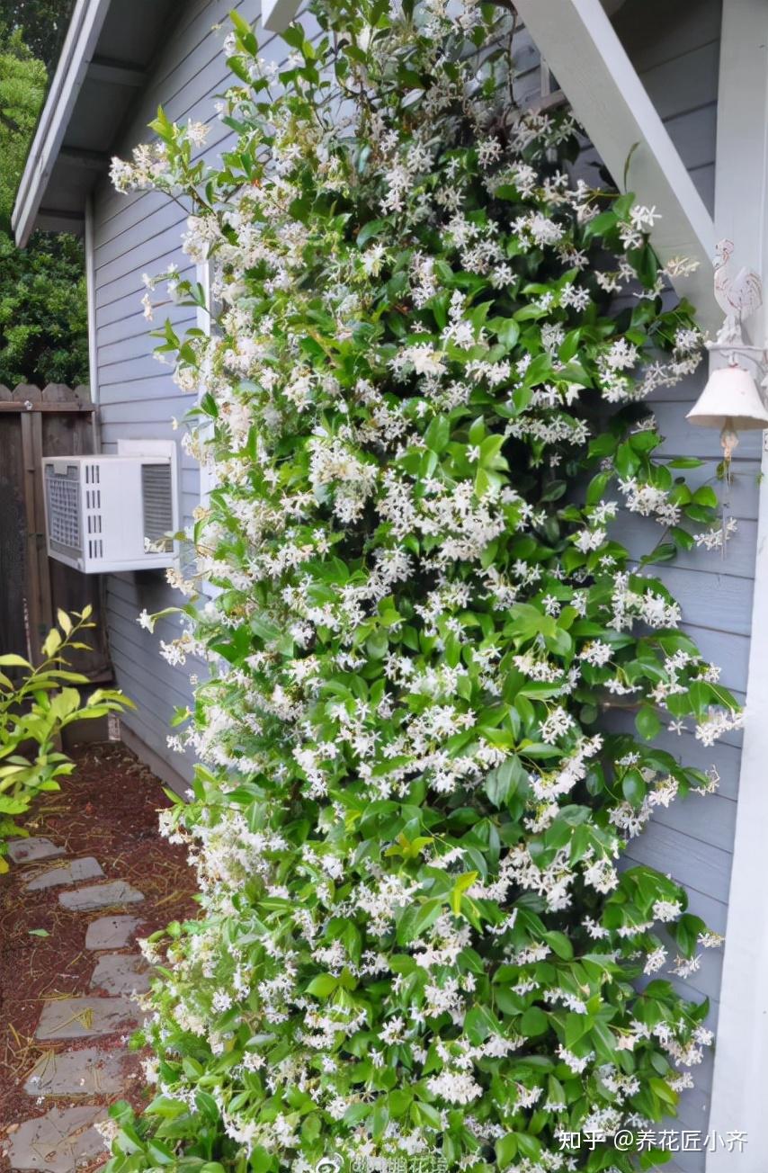 风车茉莉是属于洛石的一种,开花比较小,但是开花量非常的大,开出来的花像一个一个小风车一样,非常的美,它的颜色有黄、粉、白三种,只有白色的长势快速,而且攀爬能力非常的强。如果你有一面花墙可以去栽培,只需要做个支撑,它的枝条就会顺杆去爬,一棵苗子春天栽上,到了冬天就能够彻底的爬满,养上一年到了第二年春天就能够开出一面花墙,满院都是它的香味。哪怕是一盆小苗,放到室内满屋都能够闻到一股淡淡的茉莉香。