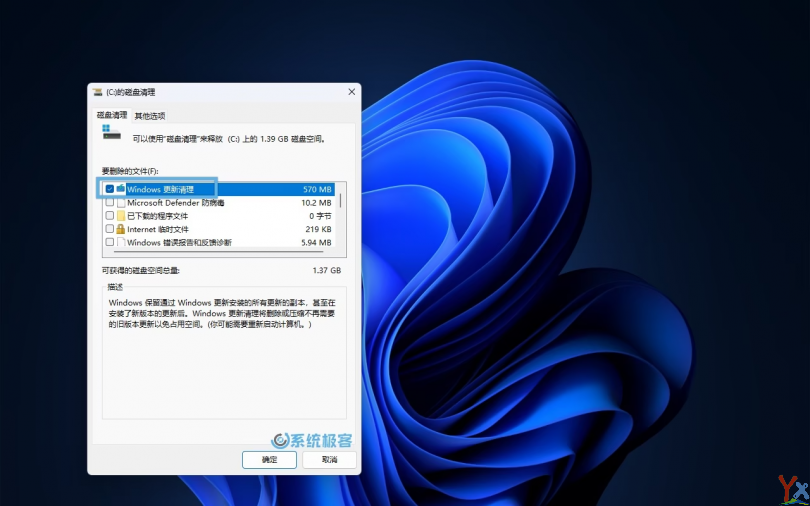 2勾选「Windows 更新清理」,点击「确定」开始清理过程。