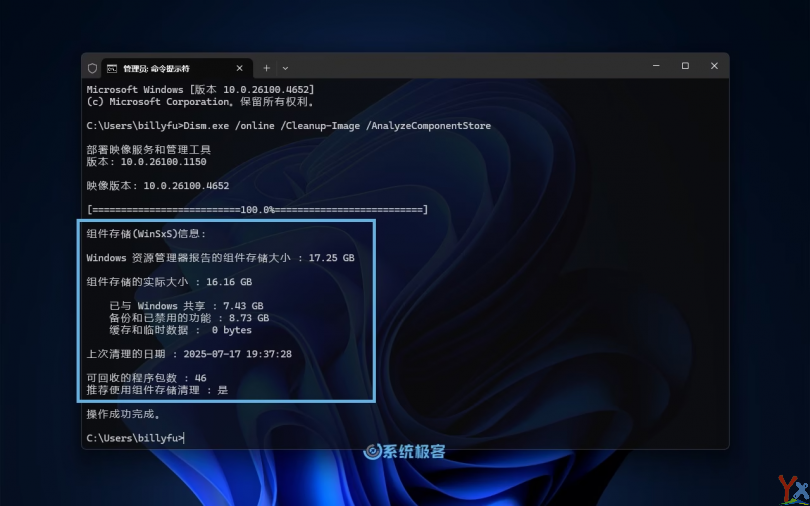 DISM 是一个功能更强大的命令行工具,可用来分析和清理 WinSxS 文件夹。它提供了更精细的控制参数,能够移除「磁盘清理」可能遗漏的文件。