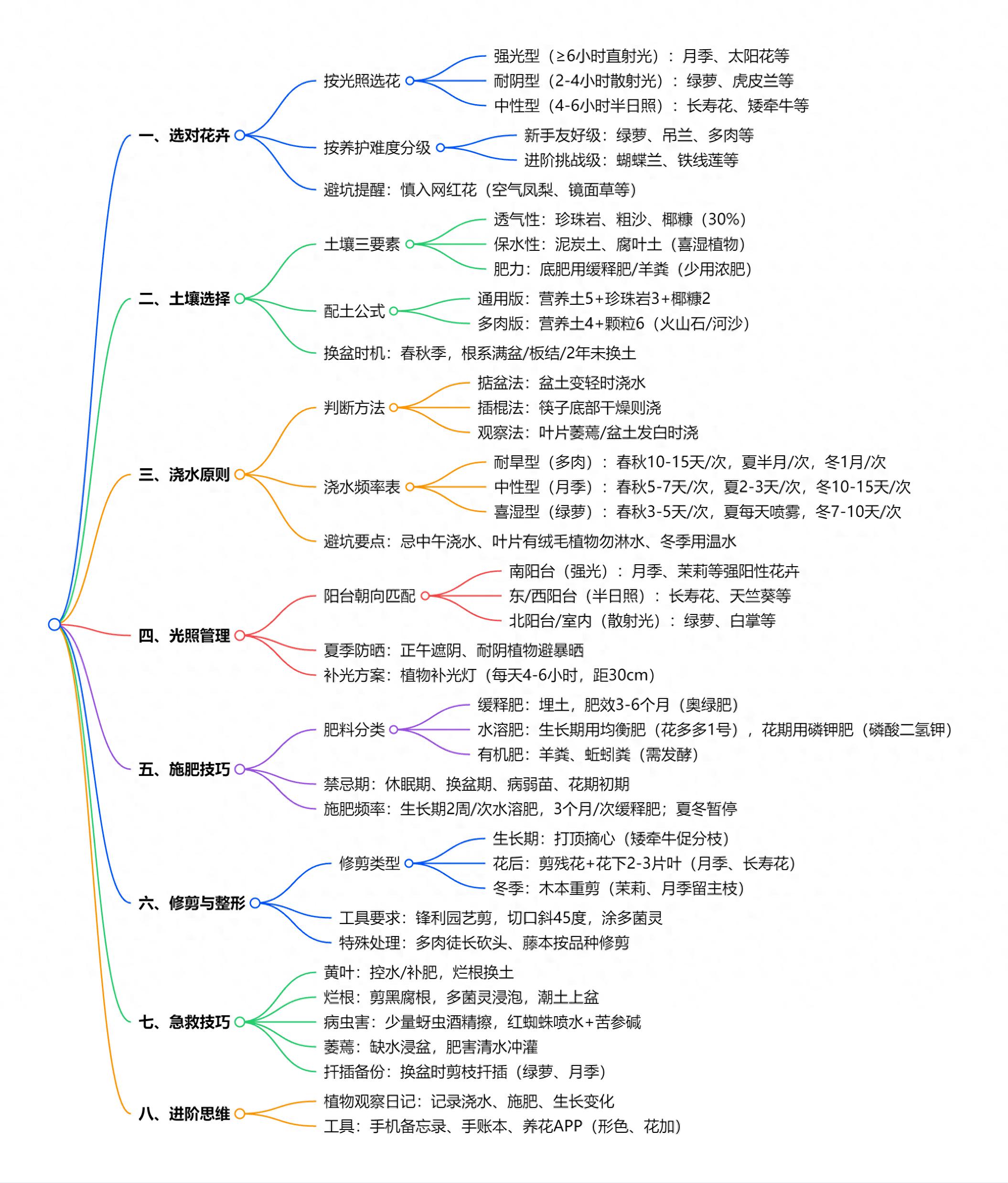 以下是新手养花必须掌握的6大基础知识,涵盖选花、土壤、浇水、光照、施肥、修剪等核心环节,附实用技巧和避坑指南,帮你从零建立养花体系: