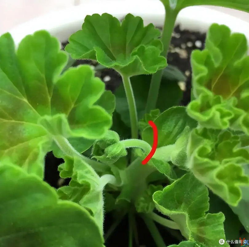 几天后,你会发现,在顶端叶片的叶腋处,会萌发出新的侧芽。等这些侧芽长到6、7片叶子的时候,再挨个对它们进行打顶,让它们继续萌发侧枝,基本上循环3、4次后,这株天竺葵就有了足够多的侧枝,整个株型就非常饱满了,花量也就有了最基本的保证。