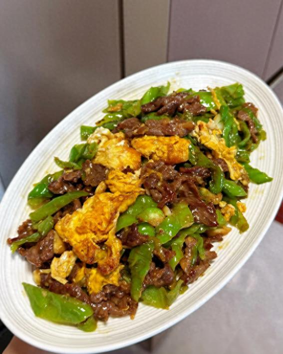 牛肉嫩得弹牙,裹着鸡蛋的香滑,青椒脆甜带点微辣,三者在嘴里碰撞,油香不腻,每口都鲜灵又下饭。