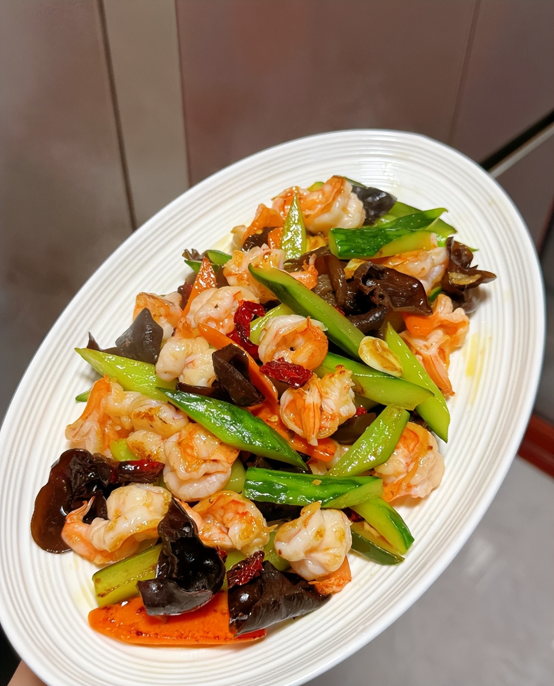 虾仁 Q 弹滑嫩,咬开带着鲜甜。青瓜脆生生的,木耳软中带韧,裹着清润的汁水,鲜爽不腻,每口都透着清爽劲儿。