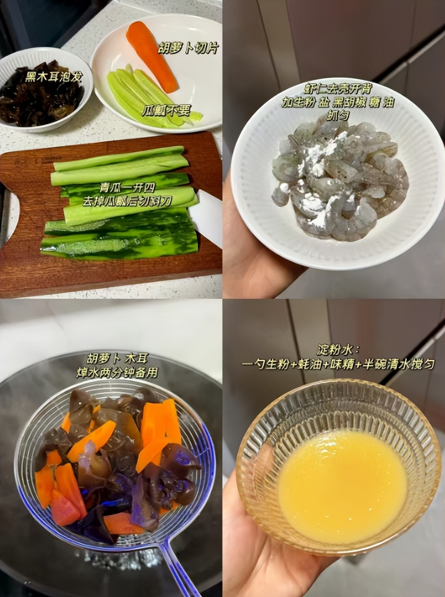 青瓜 1 根、胡萝卜 1 段、泡发木耳适量、虾仁适量、蒜末、干辣椒、盐、生抽、蚝油、味精、淀粉、食用油 。