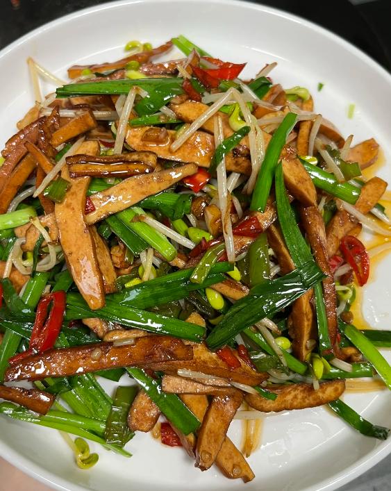 香干紧实有嚼劲,韭菜嫩得带汁,豆芽脆生生的。三者混着锅气,咸鲜里藏着清爽,嚼起来咯吱响,一口接一口停不下。