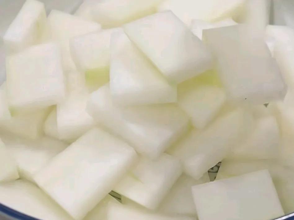 1,冬瓜切片,撒一点盐用手抓匀,接着腌制十分钟。冬瓜腌好后,放入水里清洗一下,然后挤干水分备用。