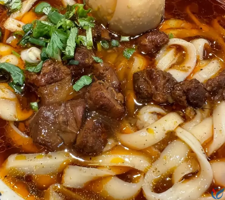 河南烩面是一种“荤、素、汤、菜、饭聚而有之”的面,讲究汤浓、面韧、配菜丰富。牛骨或羊骨熬出浓白汤底,配以宽如腰带的面条,再加上海带丝、豆腐丝、鹌鹑蛋等配料。一大碗端上来,先喝一口汤,再吃一口面,暖和又实在,是中原人从小吃到大的一碗“硬面”。