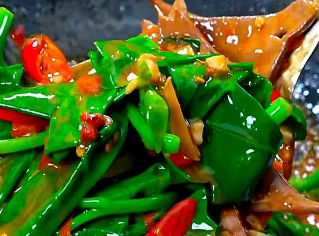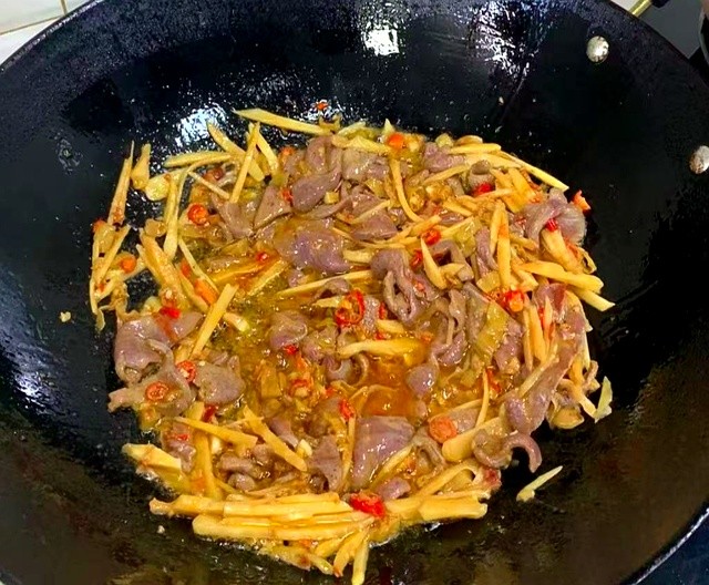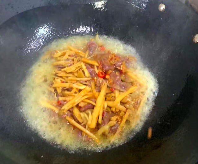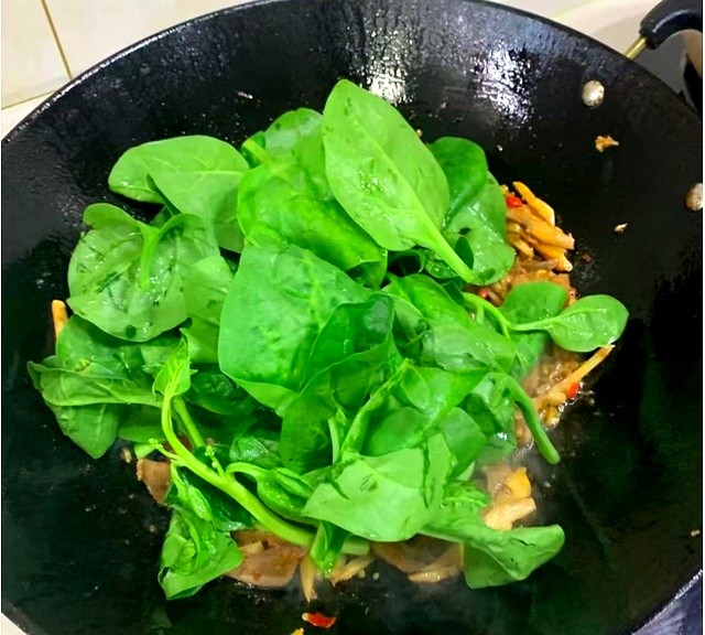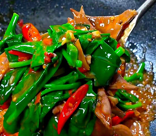 先炒猪肝到完全变色,锅里倒一勺剁椒逼香,再把木耳菜整个扔进去,盖锅十秒。