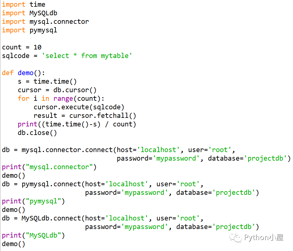 pymysql:在处理大量查询时通常比 mysql.connector 更快,这可能是由于其更轻量级的设计。