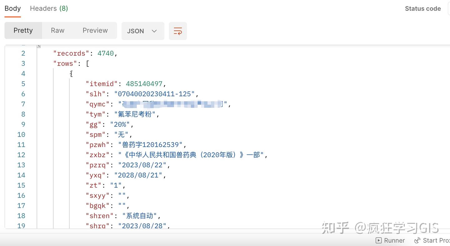 首先,来看一下我们的需求。我们现在基于Postman软件,获得了某一个网站中,以JSON格式记录的大量数据,其中部分数据如下图所示(这里是大量数据样本中的1条样本)。这里关于Postman获取网站数据的方法,大家如果有需要,可以参考文章疯狂学习GIS:Postman复制浏览器HTTP请求并加以测试、发送。