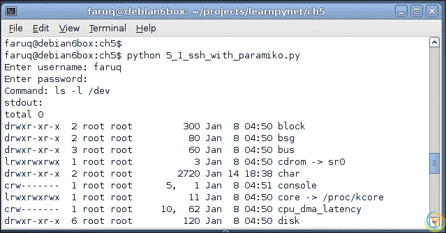 前面的脚本将与本地主机建立 SSH 连接,然后运行ls -l /dev/命令。此脚本的输出将类似于以下截图: