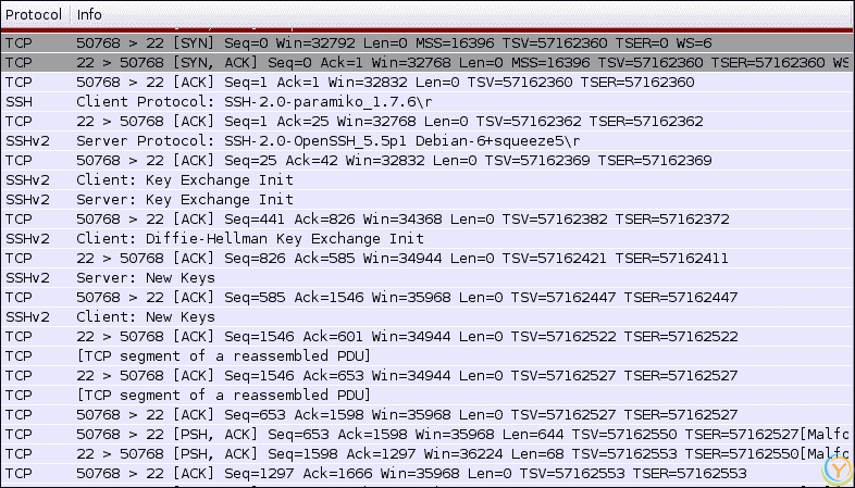 这清楚地显示了前三个数据包如何完成 TCP 握手过程。然后,随后的 SSH 数据包协商了客户端和服务器之间的连接。看到客户端和服务器如何协商加密协议是很有趣的。在这个例子中,客户端端口是50768,服务器端口是22。客户端首先启动 SSH 数据包交换,然后指示它想要使用SSHv2协议进行通信。然后,服务器同意并继续数据包交换。