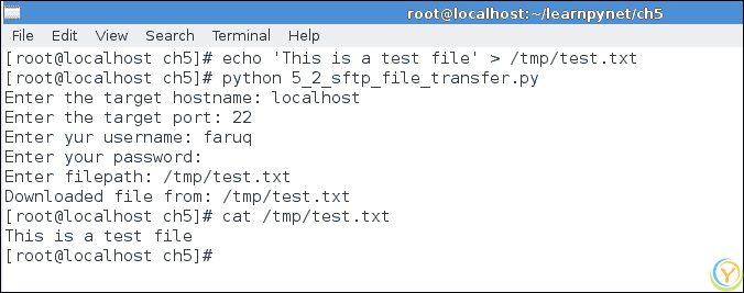 脚本可以按照以下截图所示运行。在这里,我们将首先创建一个名为/tmp/test.txt的临时文件,然后完成 SSH 登录,然后使用 SFTP 下载该文件。最后,我们将检查文件的内容。
