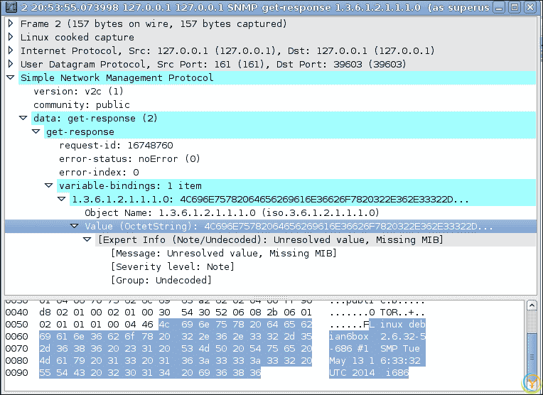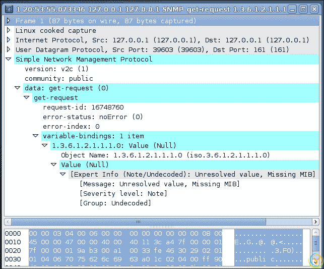 尽管使用tcpdump非常快速和简单,但该命令不会像其他 GUI 工具(如 Wireshark)那样解释它。前面的会话可以在 Wireshark 中捕获,如下面的截图所示: