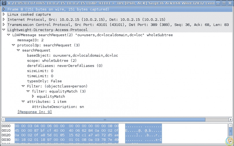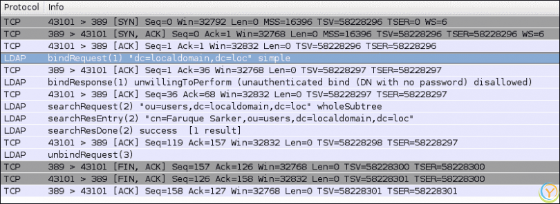 前面的通信可以通过 Wireshark 来捕获。您需要在端口 389 上捕获数据包。如下截图所示,在成功发送bindRequest之后,LDAP 客户端-服务器通信将建立。以匿名方式与 LDAP 服务器通信是不安全的。为了简单起见,在下面的示例中,搜索是在不绑定任何凭据的情况下进行的。