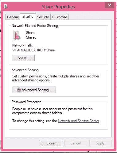 以下屏幕截图显示了如何在 Windows 7 下共享文件夹,如前所述: