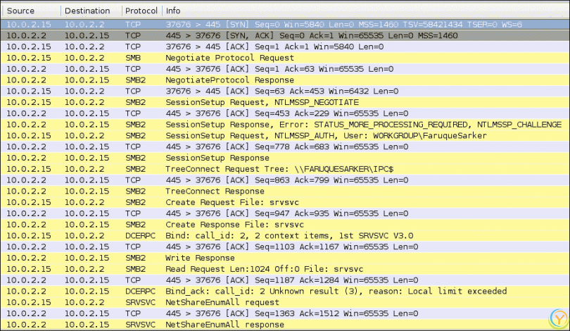 如果我们在端口445上捕获 SMABA 数据包,则可以看到 Windows 服务器如何通过 CIFS 协议与 Linux SAMBA 客户端进行通信。在以下两个屏幕截图中,已呈现了客户端和服务器之间的详细通信。连接设置如下截图所示:
