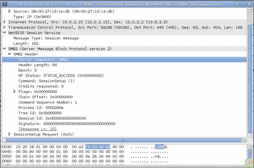 以下屏幕截图显示了典型的 SAMBA 数据包格式。此数据包的重要字段是NT_STATUS字段。通常,如果连接成功,则会显示STATUS_SUCESS。否则,它将打印不同的代码。如下屏幕截图所示: