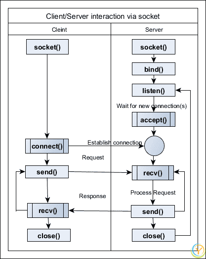 Python 有一种非常简单的方式来开始使用套接字接口。为了更好地理解这一点,让我们先了解一下整体情况。在下图中,显示了客户端/服务器交互的流程。这将让您了解如何使用套接字 API。