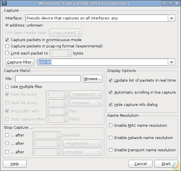 通过交换网络数据包进行的客户端和服务器之间的交互可以使用任何网络数据包捕获工具进行分析,比如 Wireshark。您可以配置 Wireshark 通过端口或主机过滤数据包。在这种情况下,我们可以通过端口 80 进行过滤。您可以在捕获 | 选项菜单下找到选项,并在捕获过滤器选项旁边的输入框中输入port 80,如下面的屏幕截图所示: