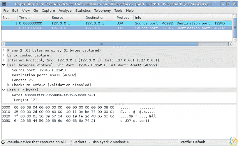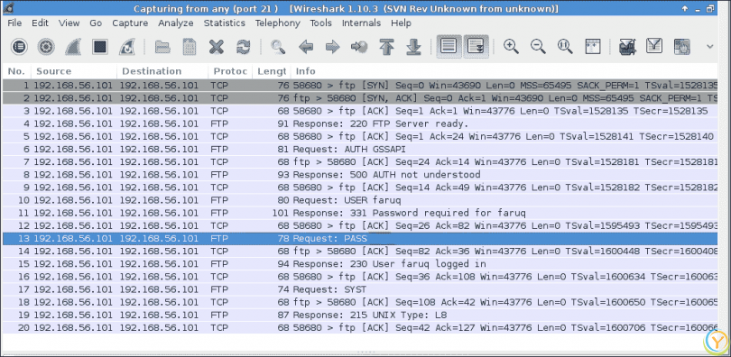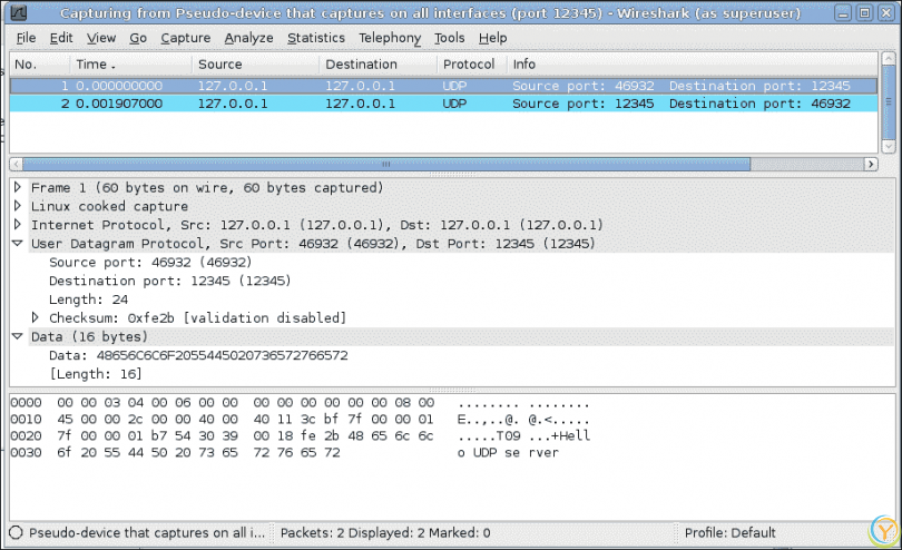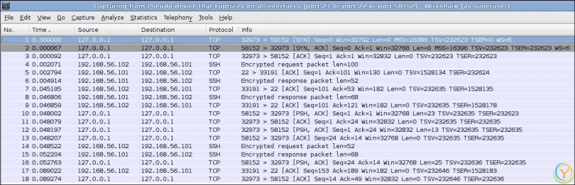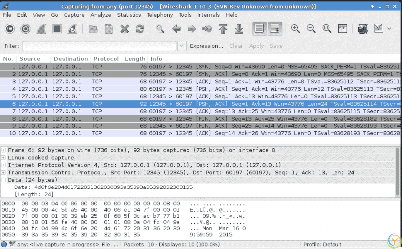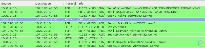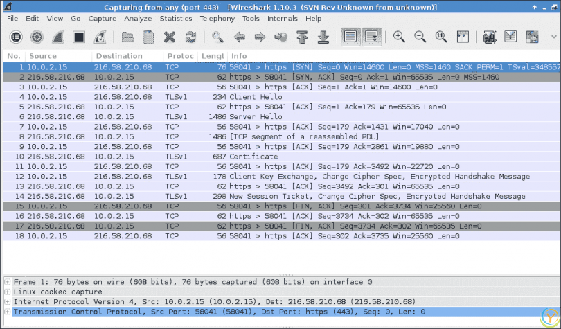 在接口选项中,我们选择捕获通过任何接口传递的数据包。现在,如果您运行上述的 TCP 客户端连接到www.linux.org,您可以在 Wireshark 中看到交换的数据包序列,如下面的屏幕截图所示: