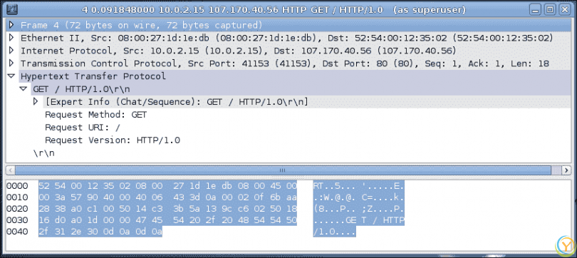 正如您所见,前三个数据包通过客户端和服务器之间的三次握手过程建立了 TCP 连接。我们更感兴趣的是第四个数据包,它向服务器发出了 HTTP 的GET请求。如果您双击所选行,您可以看到 HTTP 请求的详细信息,如下面的屏幕截图所示: