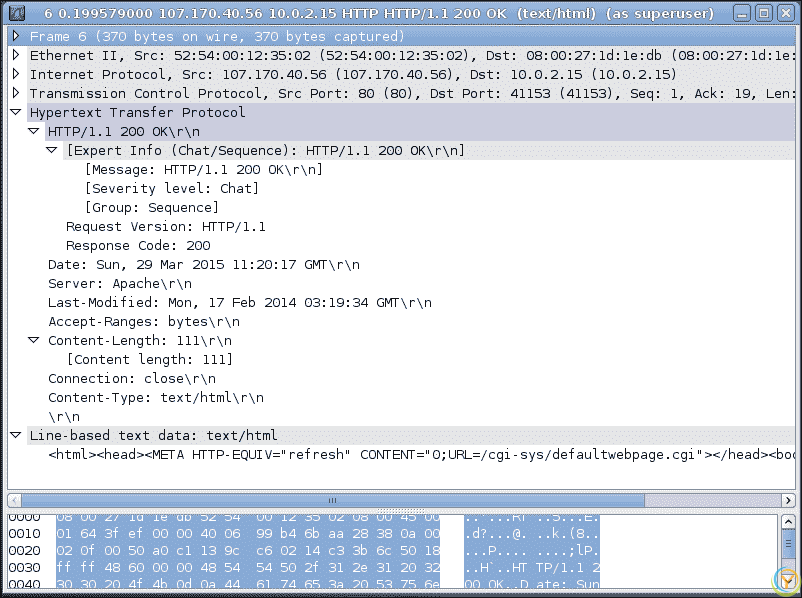 如您所见,HTTP 的GET请求还有其他组件,比如请求 URI,版本等。现在您可以检查来自 Web 服务器的 HTTP 响应到您的客户端。它是在 TCP 确认数据包之后,也就是第六个数据包之后。在这里,服务器通常发送一个 HTTP 响应代码(在本例中是200),内容长度和数据或网页内容。这个数据包的结构如下面的屏幕截图所示: