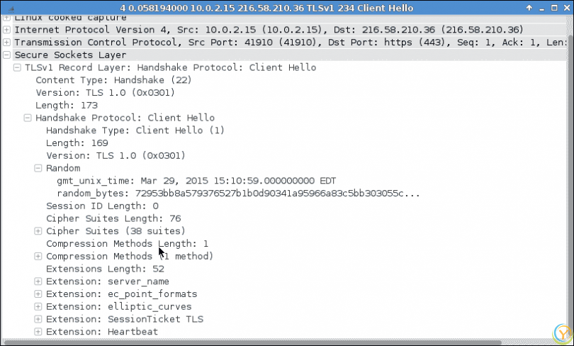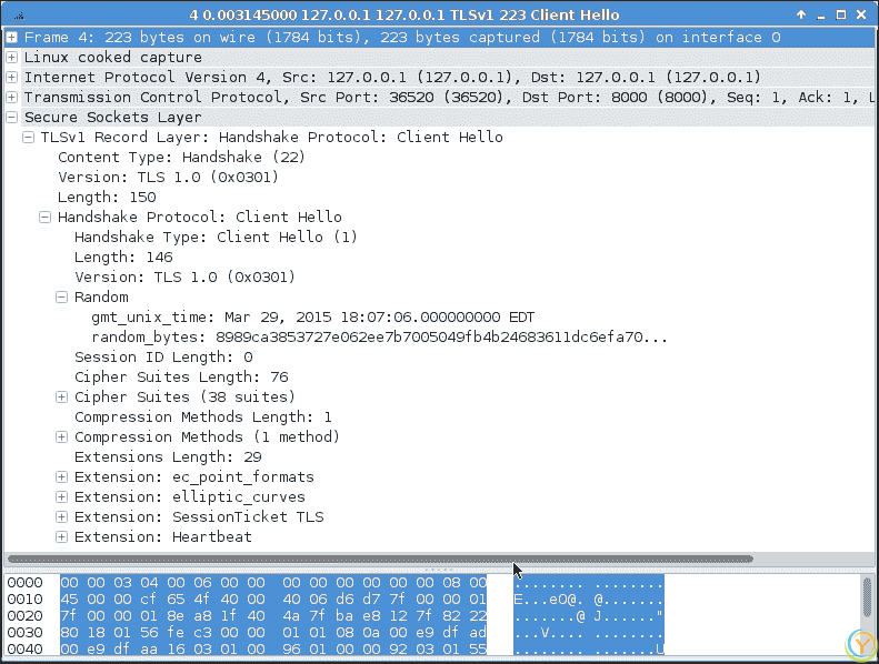 客户端的客户端 Hello数据包看起来与我们之前的 SSL 连接非常相似,如下截图所示: