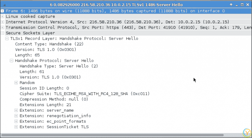 在服务器发送到客户端的第二个数据包中,服务器选择了密码套件TLS_ECDHE_RSA_WITH_RC4_128_SHA以连接到客户端。这大致意味着服务器希望使用 RSA 算法处理密钥,使用 RC4 进行加密,并使用 SHA 进行完整性检查(哈希)。这在以下屏幕截图中显示: