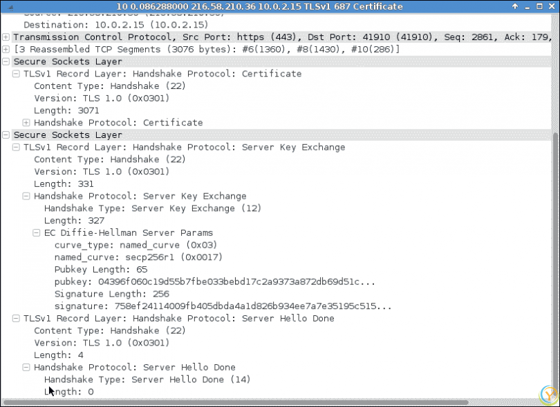 让我们再次检查 SSL 客户端/服务器的交互,以观察其中的差异。第一个截图显示了整个通信序列。在以下截图中,我们可以看到服务器的Hello和证书合并在同一消息中。