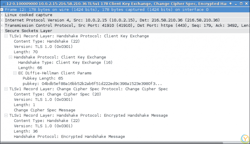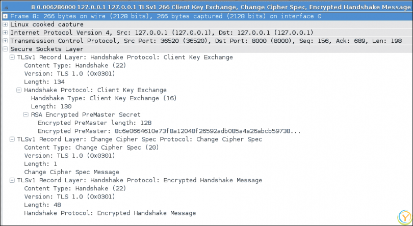 在握手的第三阶段,客户端交换密钥并计算主密钥以加密消息并继续进一步通信。客户端还发送更改在上一阶段达成的密码规范的请求。然后指示开始加密消息。以下屏幕截图显示了这个过程: