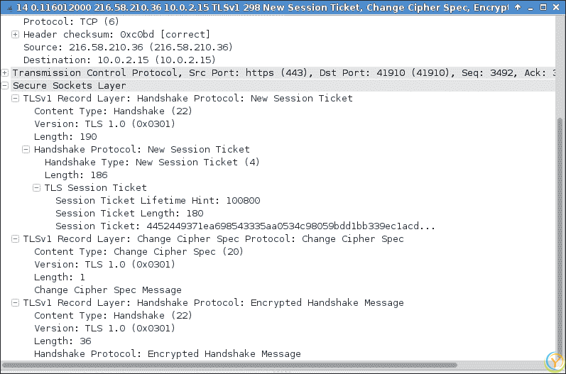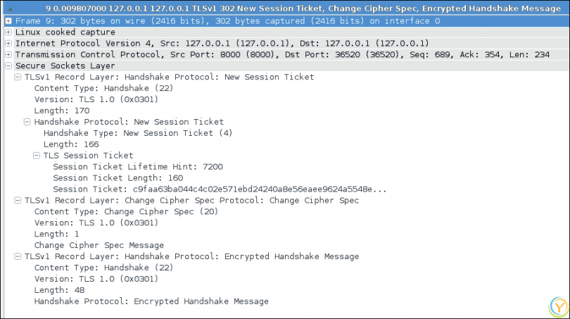 在 SSL 握手过程的最后一个任务中,服务器为客户端的特定会话生成了一个新的会话票证。这是由于 TLS 扩展引起的,客户端通过在客户端Hello消息中发送一个空的会话票证扩展来宣传其支持。服务器在其服务器Hello消息中回答一个空的会话票证扩展。这个会话票证机制使客户端能够记住整个会话状态,服务器在维护服务器端会话缓存方面变得不那么忙碌。以下截图显示了一个呈现 SSL 会话票证的示例:
