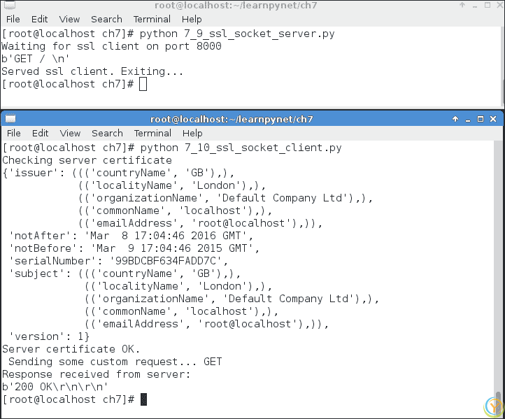 正如您所看到的,服务器套接字被wrap_socket()方法包装,该方法使用一些直观的参数,如certfile、keyfile和SSL版本号。您可以通过按照互联网上找到的任何逐步指南轻松生成证书。例如,www.akadia.com/services/ssh_test_certificate.html建议通过几个步骤生成 SSL 证书。