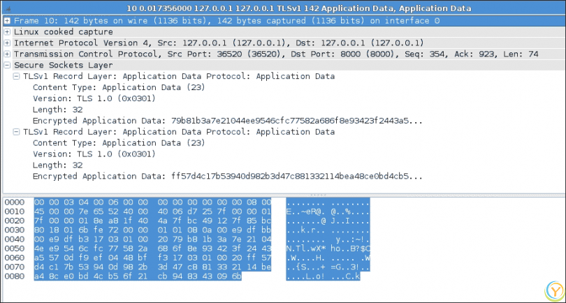 现在让我们来看一下应用数据。那加密了吗?对于捕获的数据包,它看起来像垃圾。以下截图显示了隐藏真实数据的加密消息。这就是我们使用 SSL/TLS 想要实现的效果。