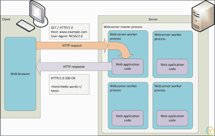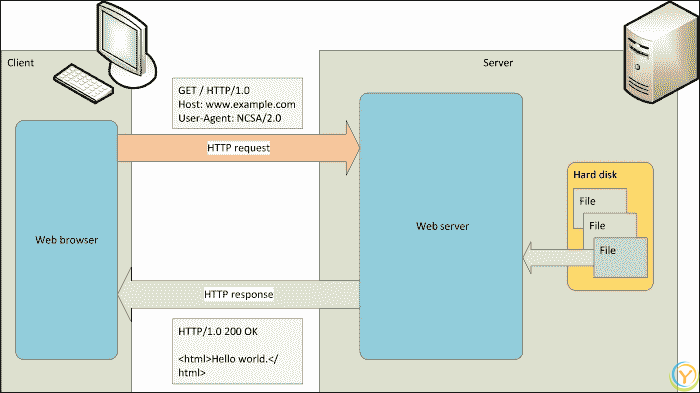 在这里,我们的 Web 客户端向服务器发送 HTTP 请求,其中 Web 服务器程序解释请求,创建适当的 HTTP 响应,并将其发送回来。在这种情况下,响应主体只是从中读取的 HTML 文件的内容,响应头由 Web 服务器程序添加。