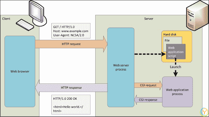 在 Web 的早期,几乎所有请求的资源都是从磁盘读取的静态文件,Web 服务器可以用一种语言编写,并且可以轻松处理前面图像中显示的所有四个步骤。然而,随着越来越多的动态内容的需求,例如购物篮和数据库驱动的资源,如博客、维基和社交媒体,很快就发现将这些功能硬编码到 Web 服务器本身是不切实际的。相反,Web 服务器内置了设施,允许调用外部代码作为页面生成过程的一部分。